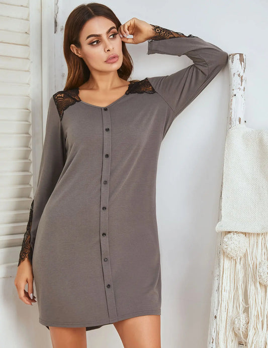 Nightdress Long Sleeve Lace Stitching Fake Placket Nightdress