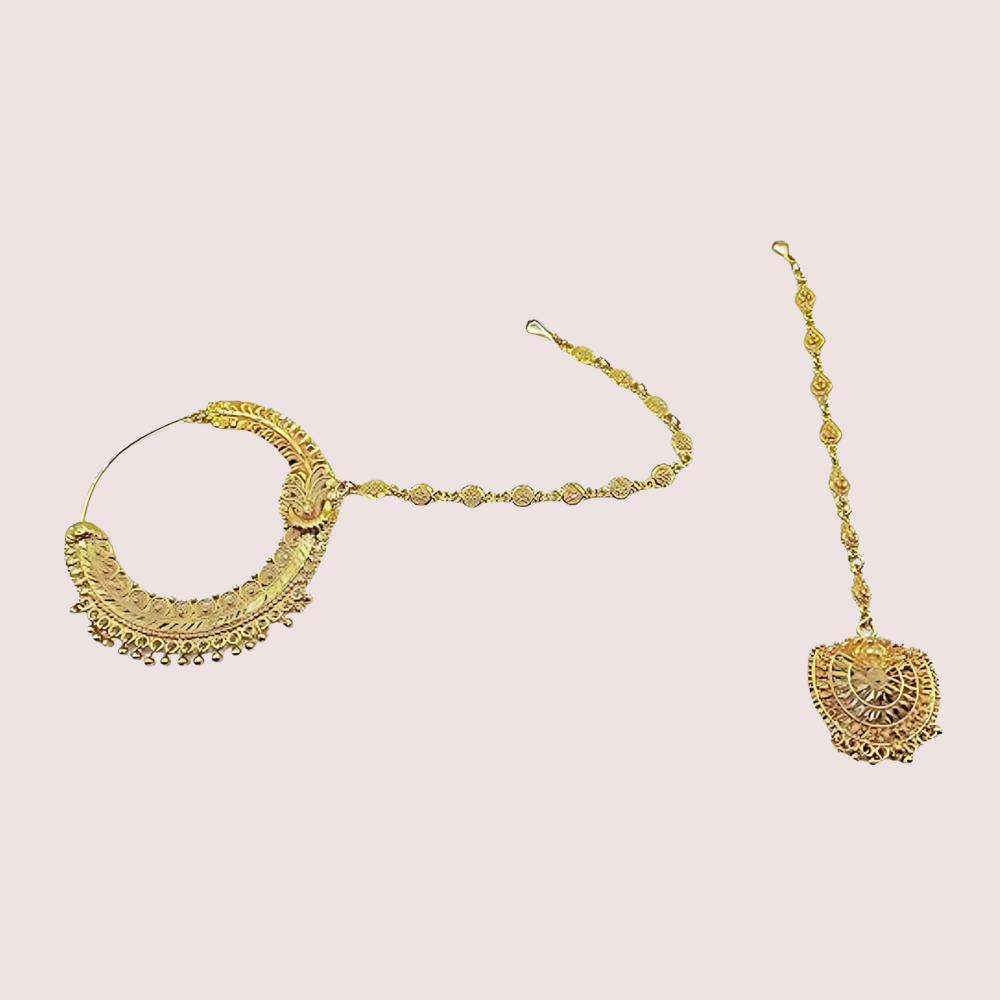 The Kumauni Guloband with Nath & Mangtika set is a stunning traditional jewelry trio. It includes a Guloband (choker necklace), a Nath (nose ring), and a Mangtika (forehead ornament). Each piece is designed with the rich cultural style of Kumaon, making it perfect for special events like weddings or festivals. The set combines elegant craftsmanship with traditional beauty, adding a touch of charm and grace to your look. Whether you’re dressing up for a celebration or embracing cultural heritage, this set is a beautiful choice.
