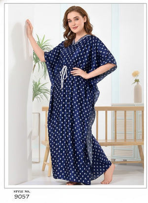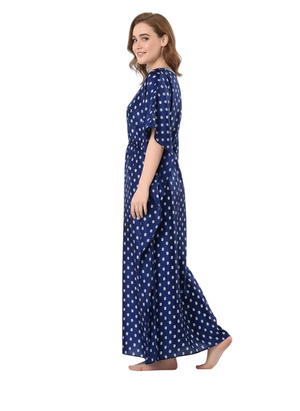 Navy blue polka dot kaftan nighty for women with soft, flowy fabric and relaxed fit—perfect for comfortable nightwear and lounging.