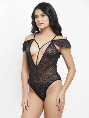 Product Description: Elevate your lingerie collection with this stunning black lace bodysuit, designed for comfort and sensuality. The delicate floral lace pattern, off-shoulder style, and daring deep plunge neckline create an irresistible look. Perfect for special occasions, date nights, or adding a touch of allure to your wardrobe. Made with breathable, stretchable fabric, this bodysuit ensures a flattering fit and all-day comfort.